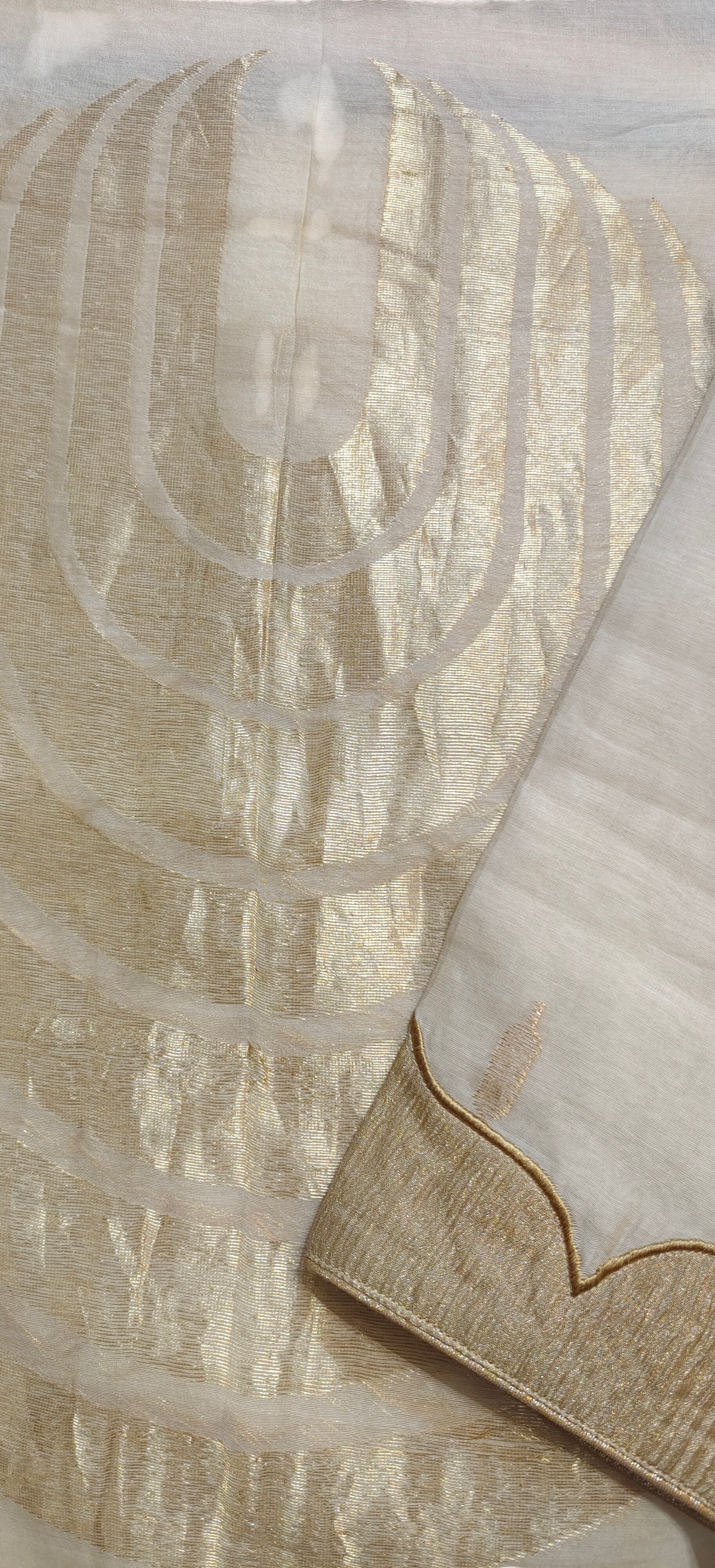 Ivory silk cropped blouse with wide three-quarter sleeves, featuring subtle gold thread motifs throughout, scalloped zari borders on cuffs and hem, and a statement gold metallic semi-circular motif on the back