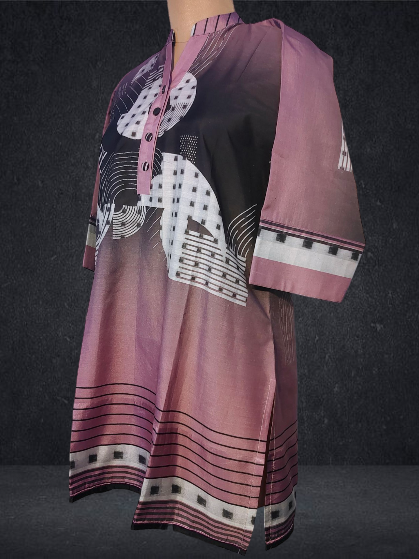 This exquisite free size stitched short length digital printed kaftan tunic is designed in cotton silk stripe textured chanderi printed handloom fabric.It has a very unique relaxed playful appeal and can be coordinated with trousers as well for a indo western look.