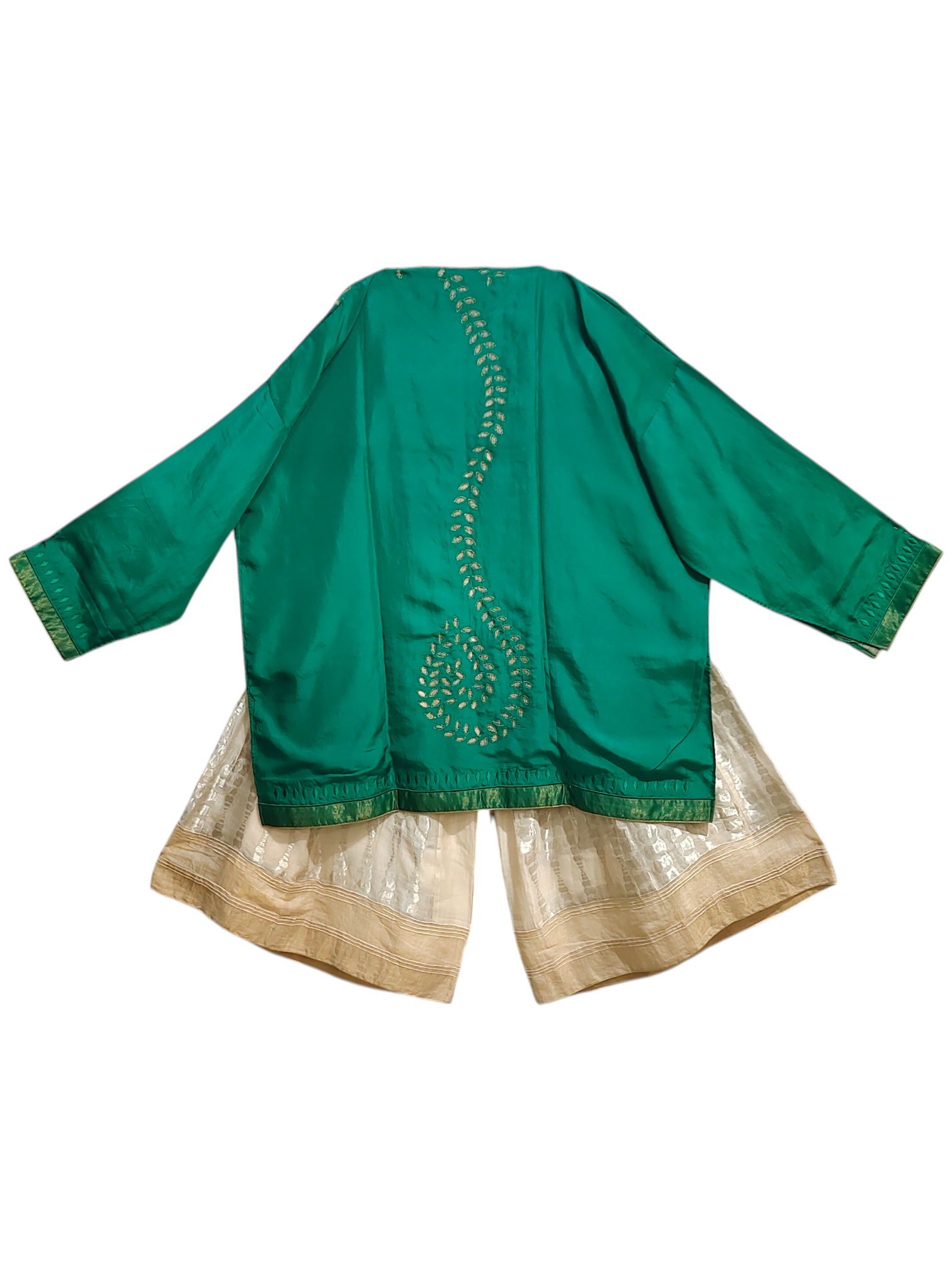 A modern Indian festive co-ord set featuring a rich emerald green silk kurta with gold cutwork reverse applique swirl motifs and minimal zari detailing on the cuffs and hem, paired with wide-legged ivory chanderi palazzo pants with metallic striped texture and broad gold borders. The styling is minimal yet luxe, echoing a contemporary ethnic aesthetic in the style of Raw Mango editorial fashion, presented against a clean background.