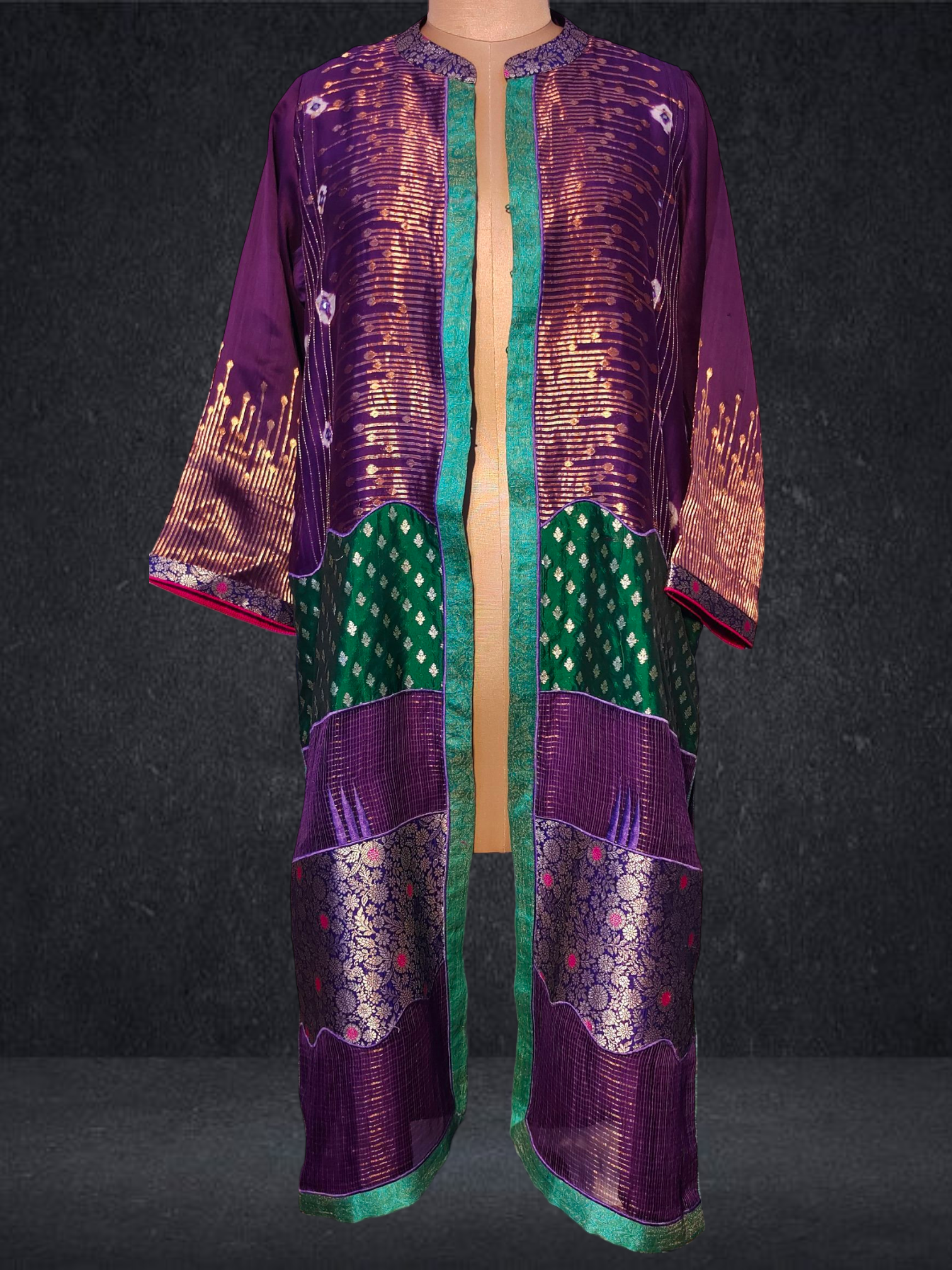 A statement longline open jacket in rich purple silk with gold metallic thread detailing, tie-dye ikat motifs, and vibrant green brocade panels with silver buta work, finished with deep purple jacquard segments and emerald green piping worn with a turquoise green silk kurta and matching pant